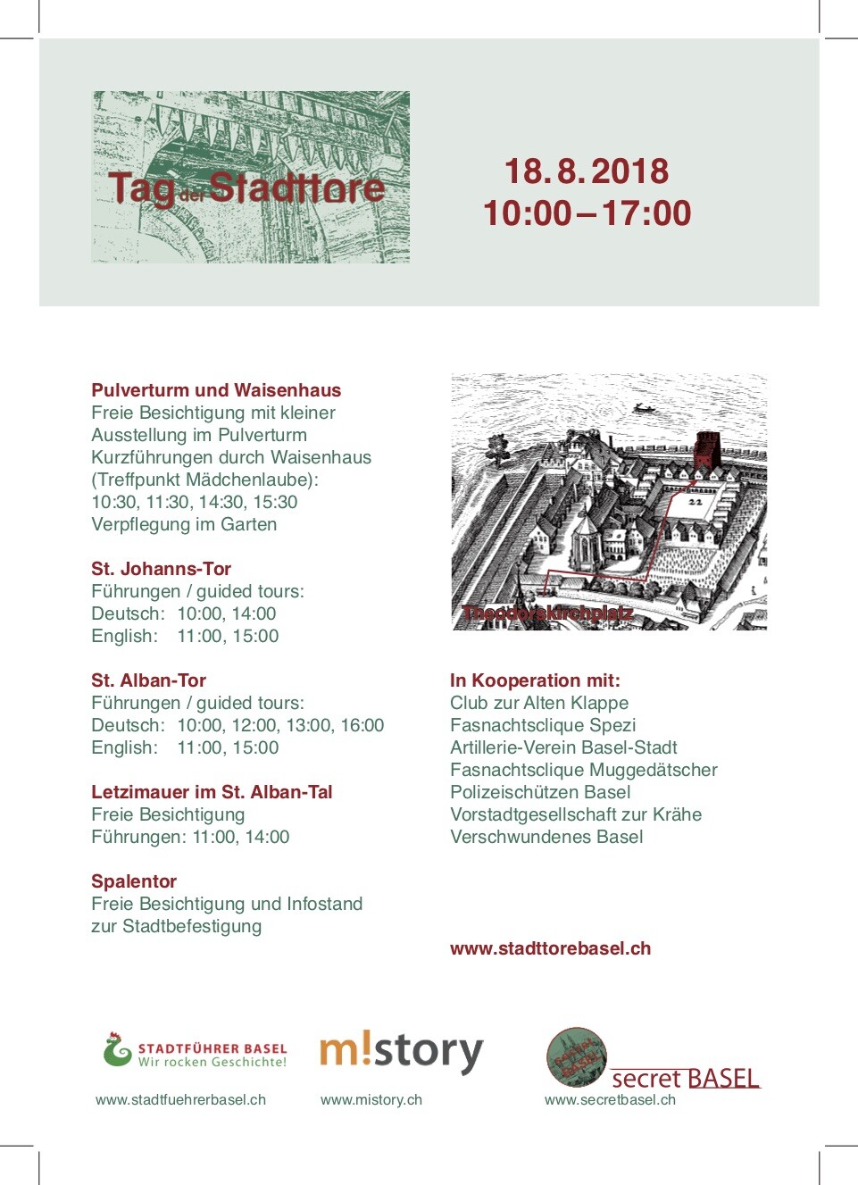Organisiert wird der Tag der Stadttore von Stadtführer Basel, m!story und secretBasel. Auskünfte: https://www.stadttorebasel.ch, Mike Stoll, mistoll@mistory.ch, 078 836 06 64