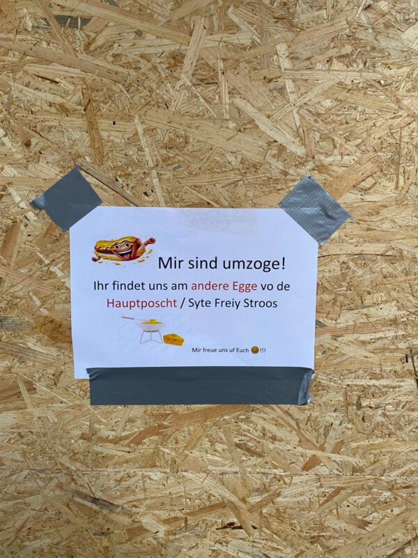 Ein Wurststand ist weg! Dafür hängt aber ein Plakat an der Stelle, wo der Stand sonst war. Ich frage mich wirklich, ob jemand an die Fasnacht geht und sagt: „Gäll, Schatz, mir göhn den aber zu däm Wurschtstand bi dr Hauptposcht!“. Vielleicht ja schon. In jedem Falle hat der Wurstverkäufer oder die Wurstverkäuferin vorgesorgt.