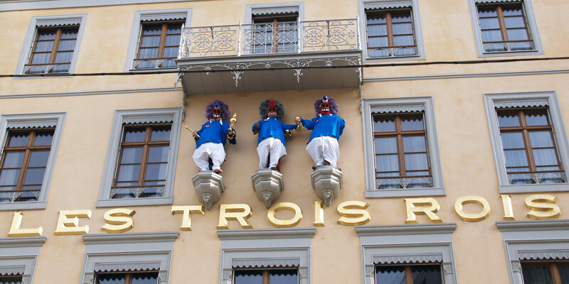 Seit dem Jahre 1754 thronen über dem Hauptportal des Grand Hotel Les Trois Rois am Blumenrain die Statuen von Kaspar, Melchior und Balthasar. Diese werden jedes Jahren durch die «Lufthyler-Waggis» am Donnerstag vor dem Morgestraich kostümiert. So werden aus den Königsfiguren die Drei Waggis Kaschper, Melchi und Balz.