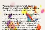 Die IG Chaise weist wiederum darauf hin, dass diverse Chaisen am Blumenrain, vor dem Hotel Drey Waggis (Hotel drei Könige) bewundert werden können. Treffpunkt ist wie immer der Fasnachts-Mittwoch 4. März 2020 nach dem Cortège ca. 1730 Uhr Man erhält die Gelegenheit die Chaisen und deren Mitfahrer/Innen von nahem zu bewundern, das ausgespielte Sujet zu