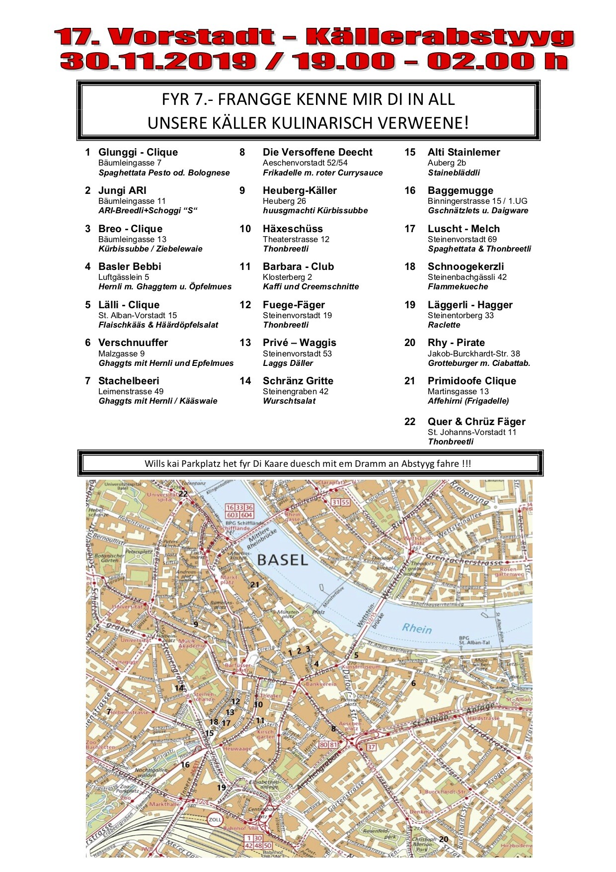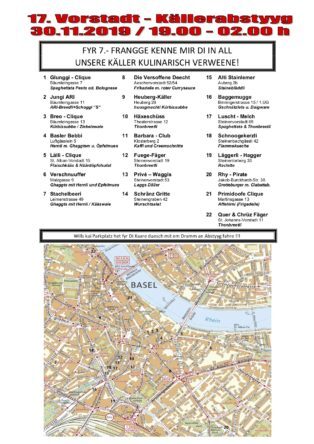 Bereits zum 17. Mal findet am Samstag, 30. November 2019, der Vorstadt-Källerabstyyg statt. Der traditionelle und beliebte Anlass, welcher nur alle zwei Jahre durchgeführt wird, beginnt um 19:00 Uhr und dauert bis um 2:00 Uhr morgens. Die teilnehmenden Cliquen und Guggen öffnen ihre sonst nur an der Fasnacht zugänglichen Kellerlokale und verwöhnen die Gäste wiederum mit zahlreichen kulinarischen Köstlichkeiten. Für nur CHF 7.00 bietet jeder Verein ein feines Menu an.