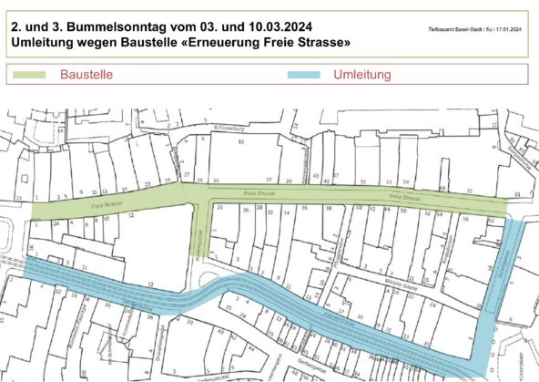 Für das traditionelle Defilee durch die Freie Strasse empfiehlt das Bau- und Verkehrsdepartement darum allen Cliquen und Formationen den unteren Teil der Freien Strasse via Streitgasse, Falknerstrasse und Gerbergasse zu umgehen. Verkehrswachen und Informationstafeln werden die Bummel-Formationen sicher an den Bauabsperrungen vorbei lenken und auf die Umleitungsroute hinweisen. Sollte es notwendig sein, wird die BVB den Tramverkehr in der Falknerstrasse an diesen Sonntagen bereits früher als üblich umleiten.