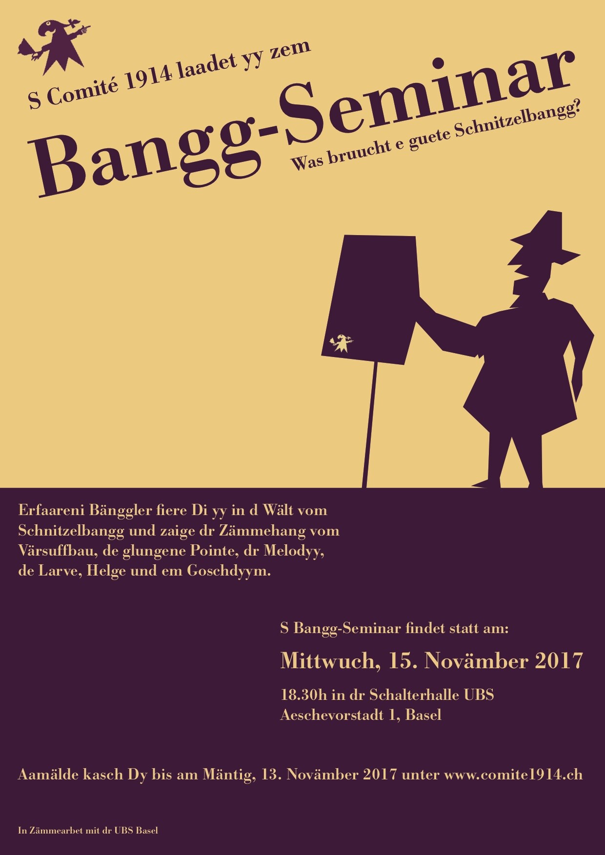 Unter dem Motto „Was bruucht e guete Schnitzelbangg?“ ladet das Comité 1914 zu einem Seminar für Schnitzelbänkler und solche, die es werden wollen, ein. Den Inhalt umschreiben die Organisatoren wie folgt: „Erfaareni Bänggler fiere Di yy in d Wält vom Schnitzelbangg und zaige dr Zämmehang vom Värsuffbau, de glungene Pointe, dr Melodyy, de Larve, Helge und em Goschdyym.“ Das Seminar findet statt am Mittwoch, 15. November 2017 um 18.30h in der Schalterhalle UBS Aeschenvorstadt 1, Basel. Anmelden kann man sich bis 13. November 2017 unter www.comite1914.ch.