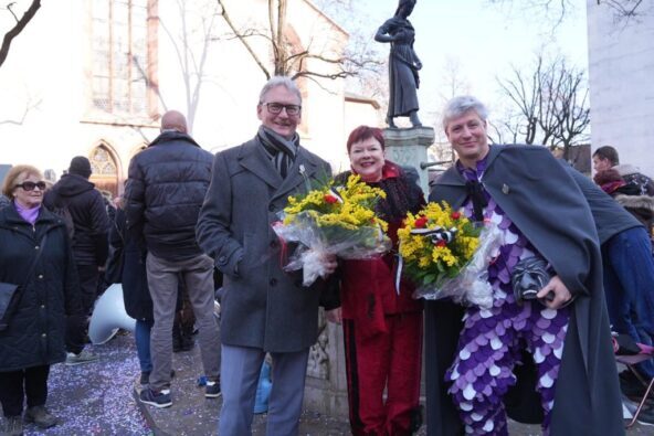 Stellvertretend für alle Mitarbeitenden der Basler Verkehrs-Betriebe und aller anderen Verkehrsbetriebe, die uns pünktlich zum Morgestraich an den Ort des Geschehens gebracht hatten, nahmen BVB-Direktor Bruno Stehrenberger und Fahrplanleiter Chris Gugger heute Nachmittag einen Blumenstrauss von Pia Inderbitzin in Empfang. Auch an dieser Stelle danken wir ganz herzlich für den grossartigen Einsatz!