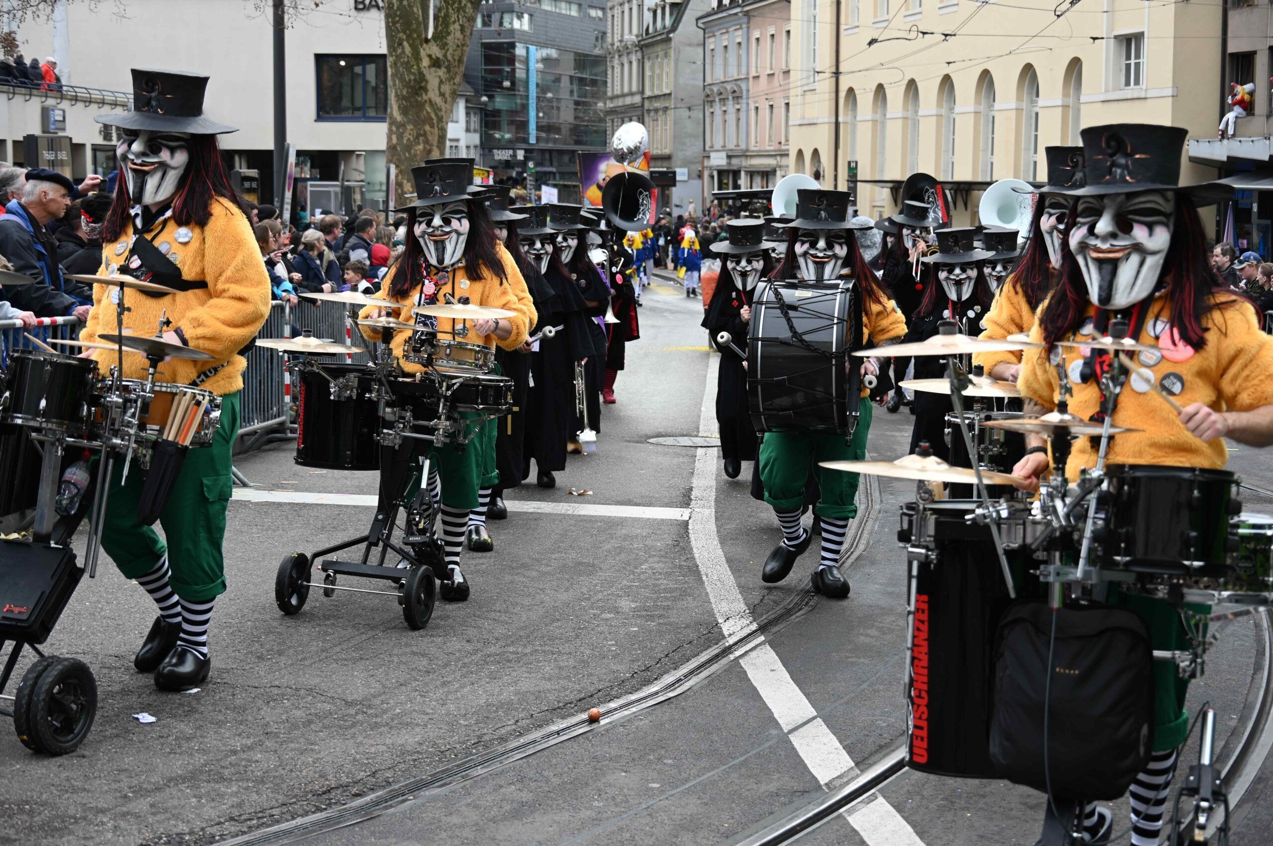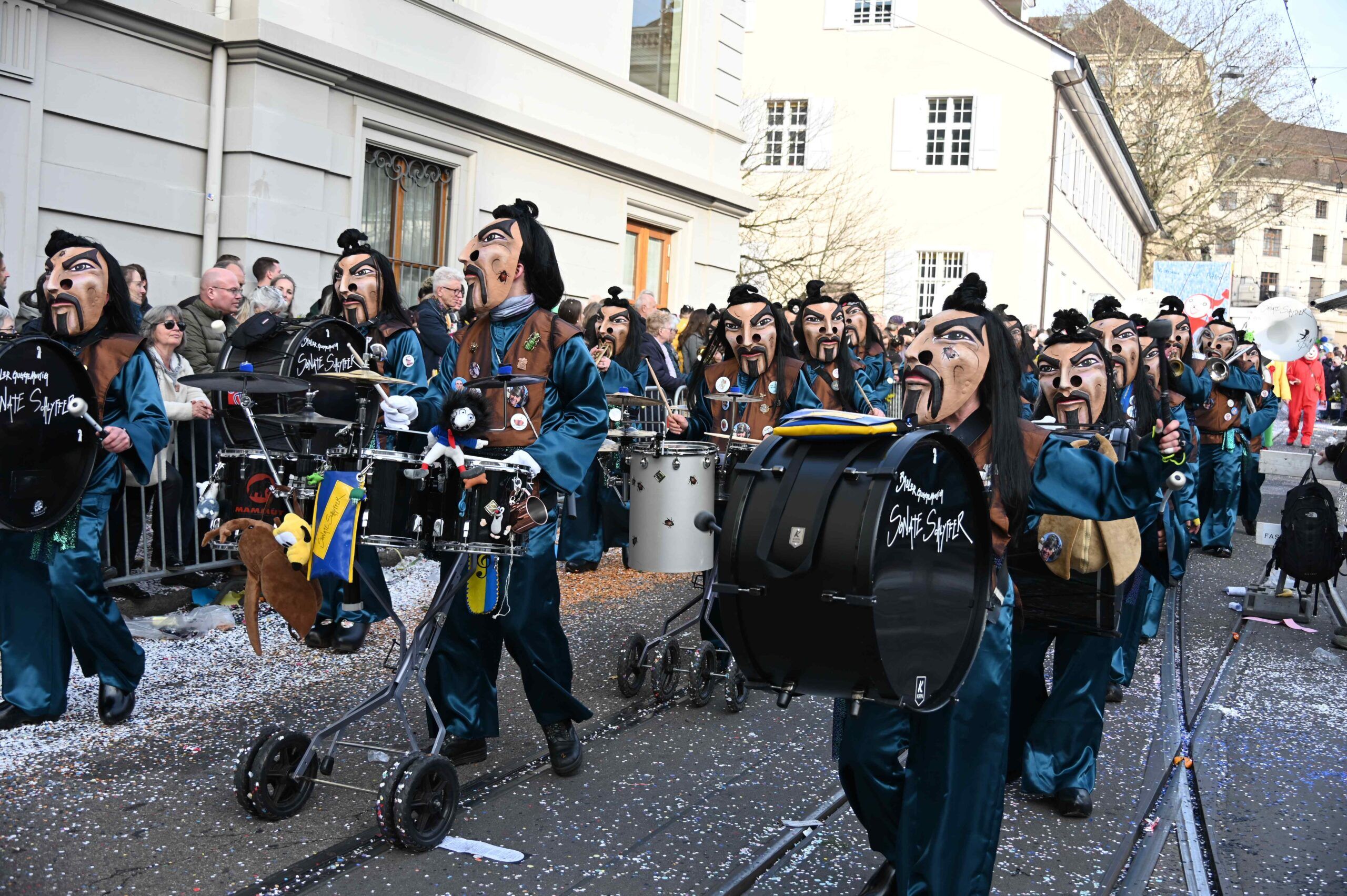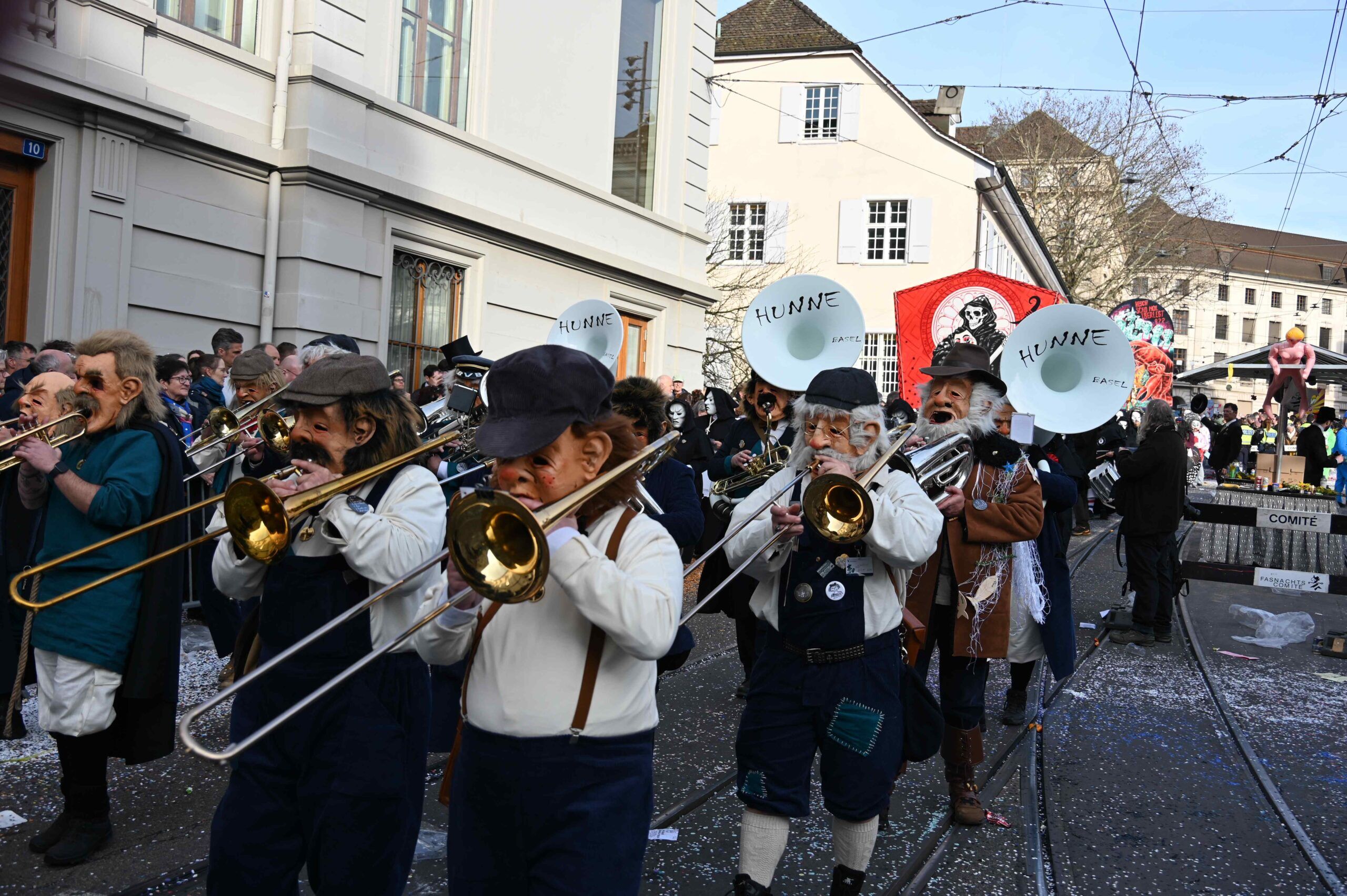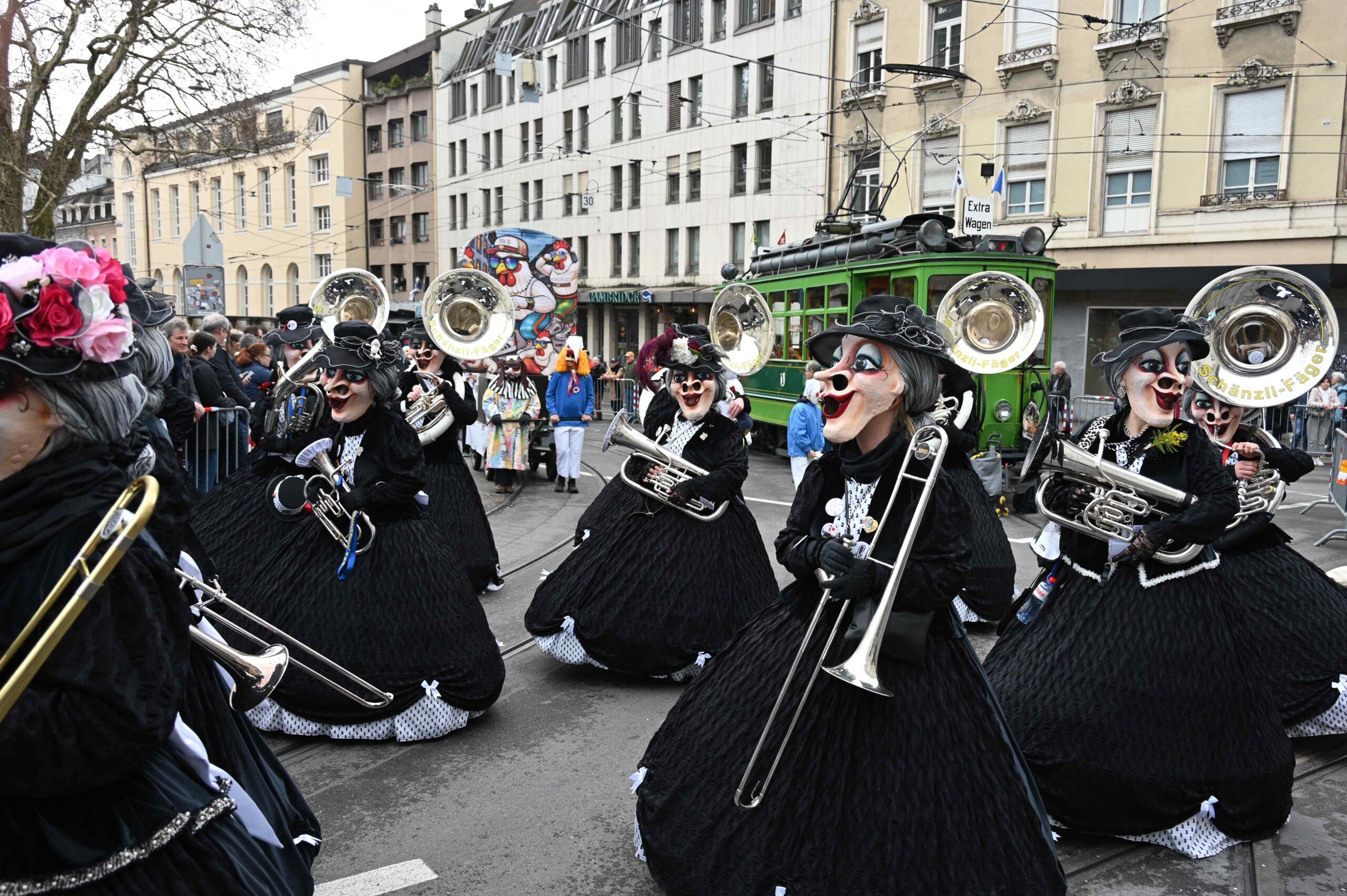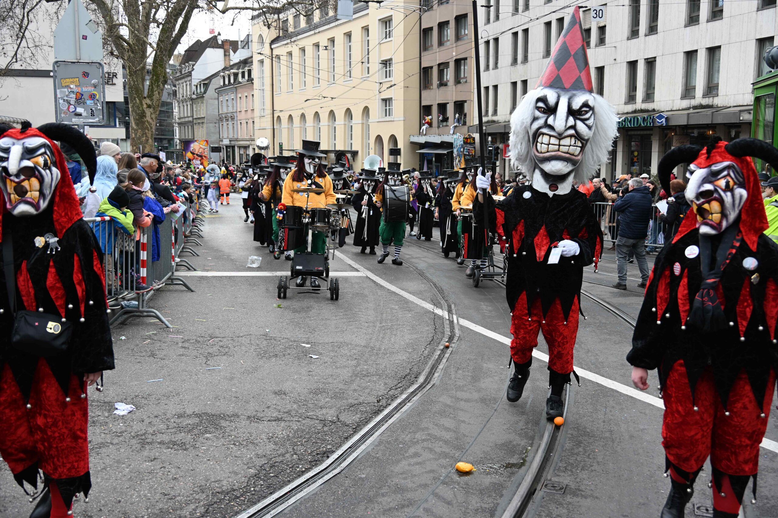 D Gladdi-Addore 13+12 fühlen sich vom Fasnacht-Comité an der Nase herumgeführt ob der Verlegung der Cortège-Route unter dem Motto: „Ojeeminee – das Comité!“ Noch immer über das Böögg-Disaster lachen Heuwänder Gugge 1953 und d Quätschkomode, während d Hunne Basel „800 Joor Ryybrugg“ feiern. Weiterhin kämpferisch zeigen sich d LäGGerli-HaGGer und weibeln für den Weiterbestand des Musical-Theaters und klagen „d Basler Kultur goot baade“ sie laufen mit de Note-Tramper, die „Goschdyym recycle“. Fusioniert haben d Guggemusik Mohrekopf und Messingkäfer verbandelten sich ab der Fasnacht 25 zu den Messingkopf und präsentieren sich in voller Pracht! D Negro Rhygass laufen mit Larve und spielen mit Larve gemäss ihrem Sujet: „Negro-Rhygass – die letscht Guggemuusig vo Basel!“