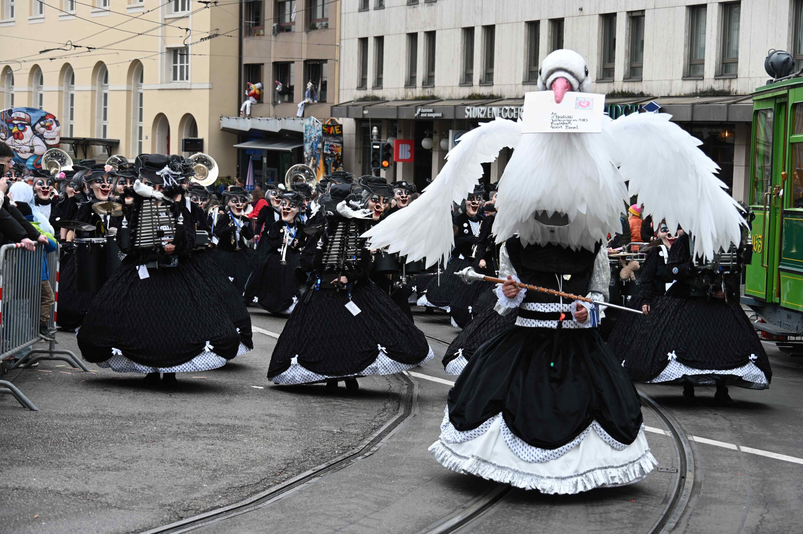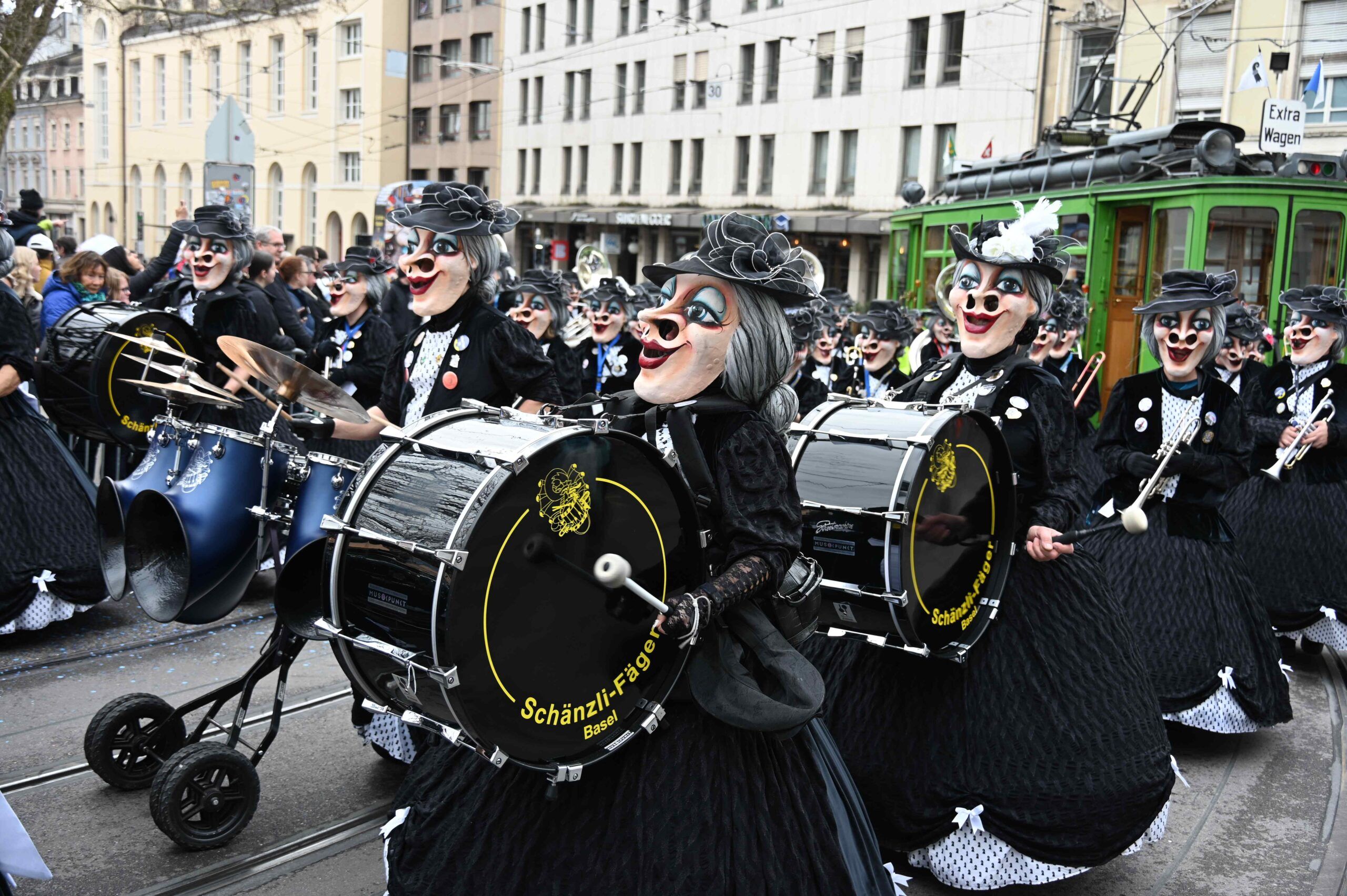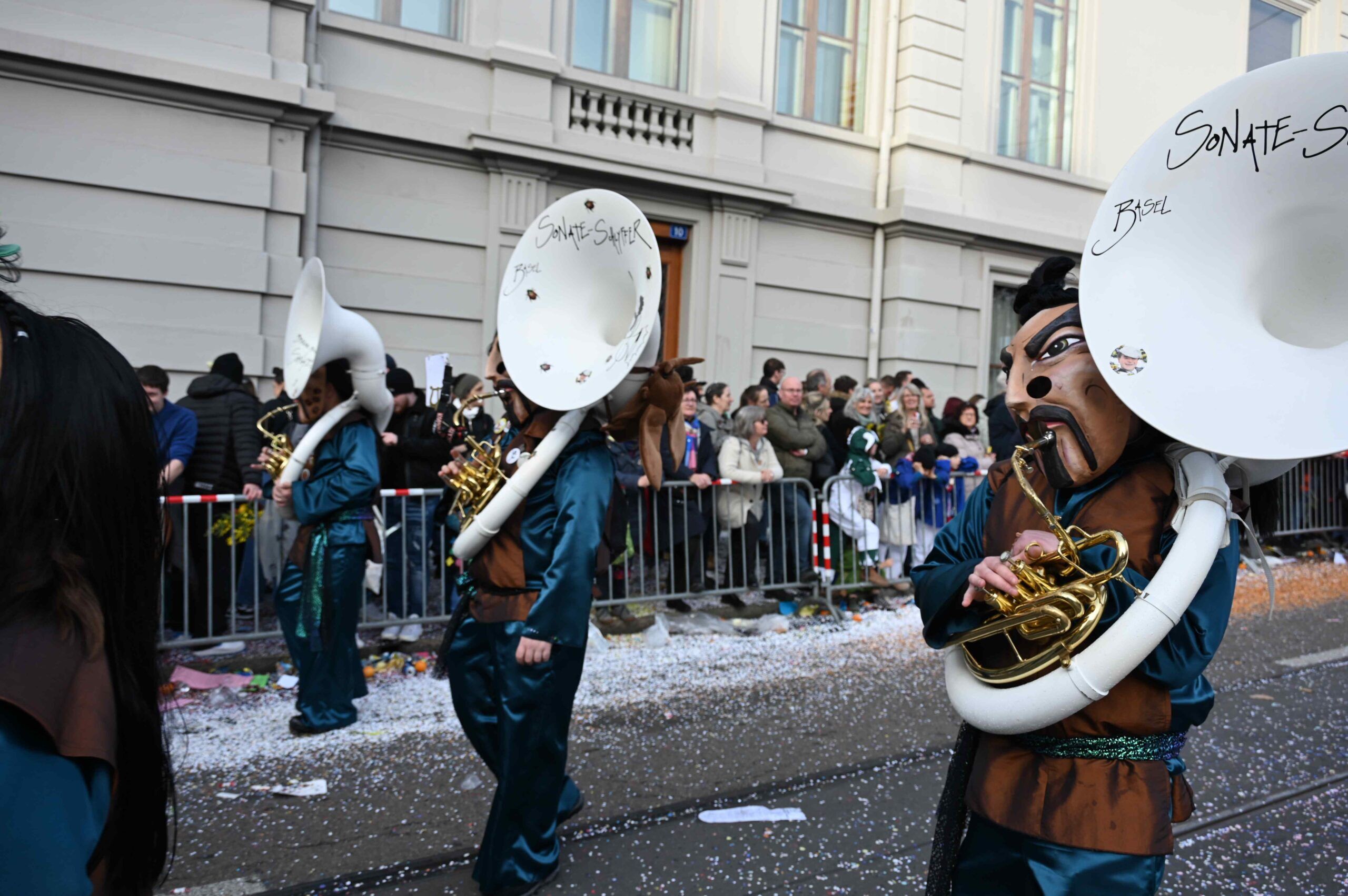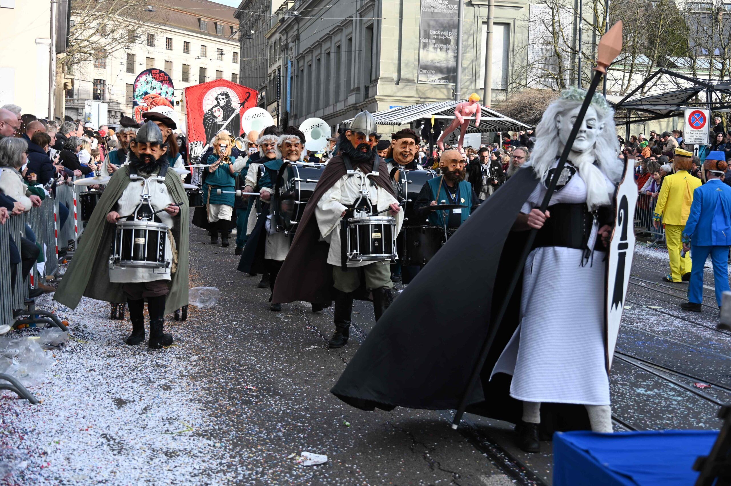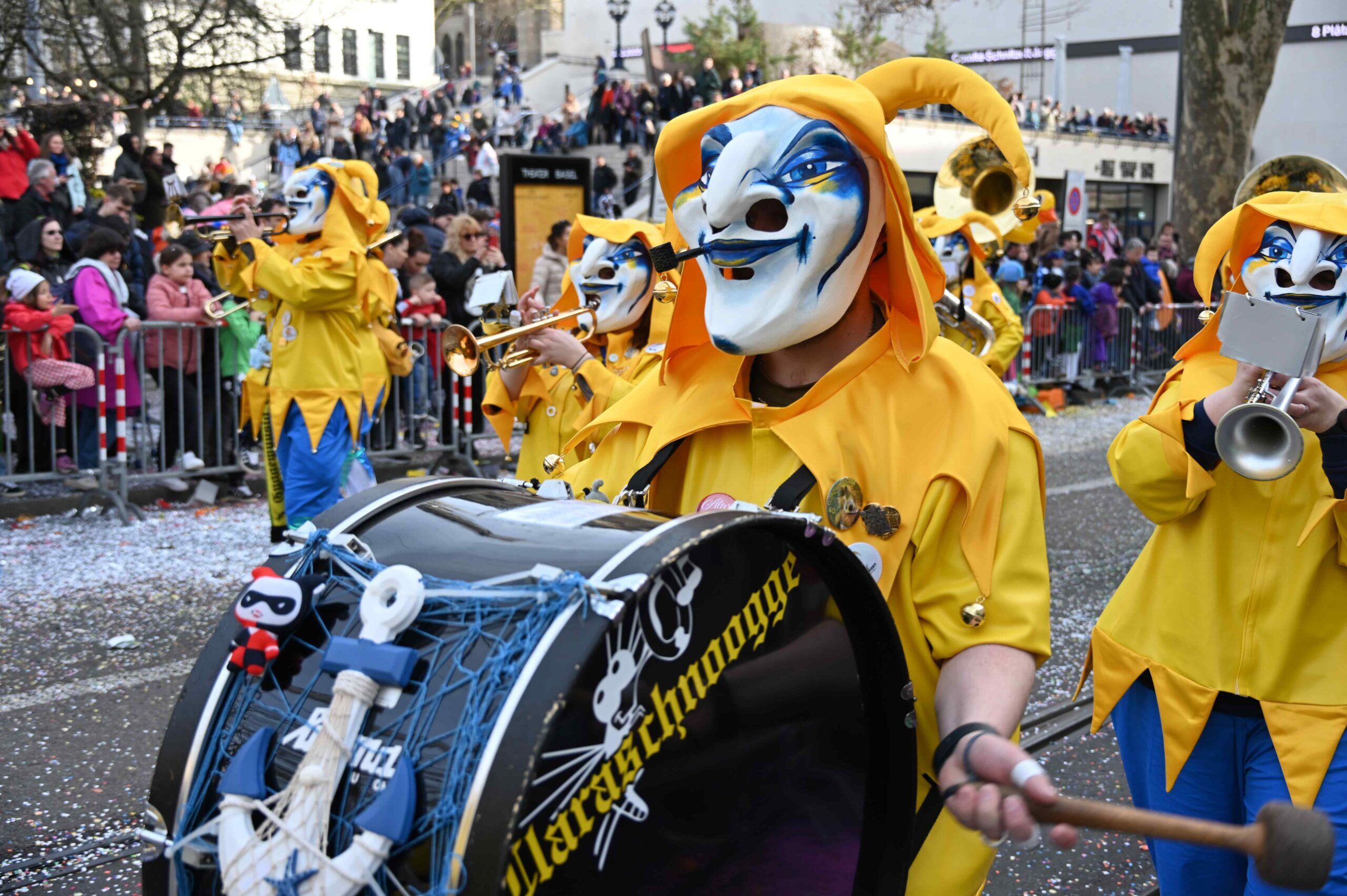 D Gladdi-Addore 13+12 fühlen sich vom Fasnacht-Comité an der Nase herumgeführt ob der Verlegung der Cortège-Route unter dem Motto: „Ojeeminee – das Comité!“ Noch immer über das Böögg-Disaster lachen Heuwänder Gugge 1953 und d Quätschkomode, während d Hunne Basel „800 Joor Ryybrugg“ feiern. Weiterhin kämpferisch zeigen sich d LäGGerli-HaGGer und weibeln für den Weiterbestand des Musical-Theaters und klagen „d Basler Kultur goot baade“ sie laufen mit de Note-Tramper, die „Goschdyym recycle“. Fusioniert haben d Guggemusik Mohrekopf und Messingkäfer verbandelten sich ab der Fasnacht 25 zu den Messingkopf und präsentieren sich in voller Pracht! D Negro Rhygass laufen mit Larve und spielen mit Larve gemäss ihrem Sujet: „Negro-Rhygass – die letscht Guggemuusig vo Basel!“