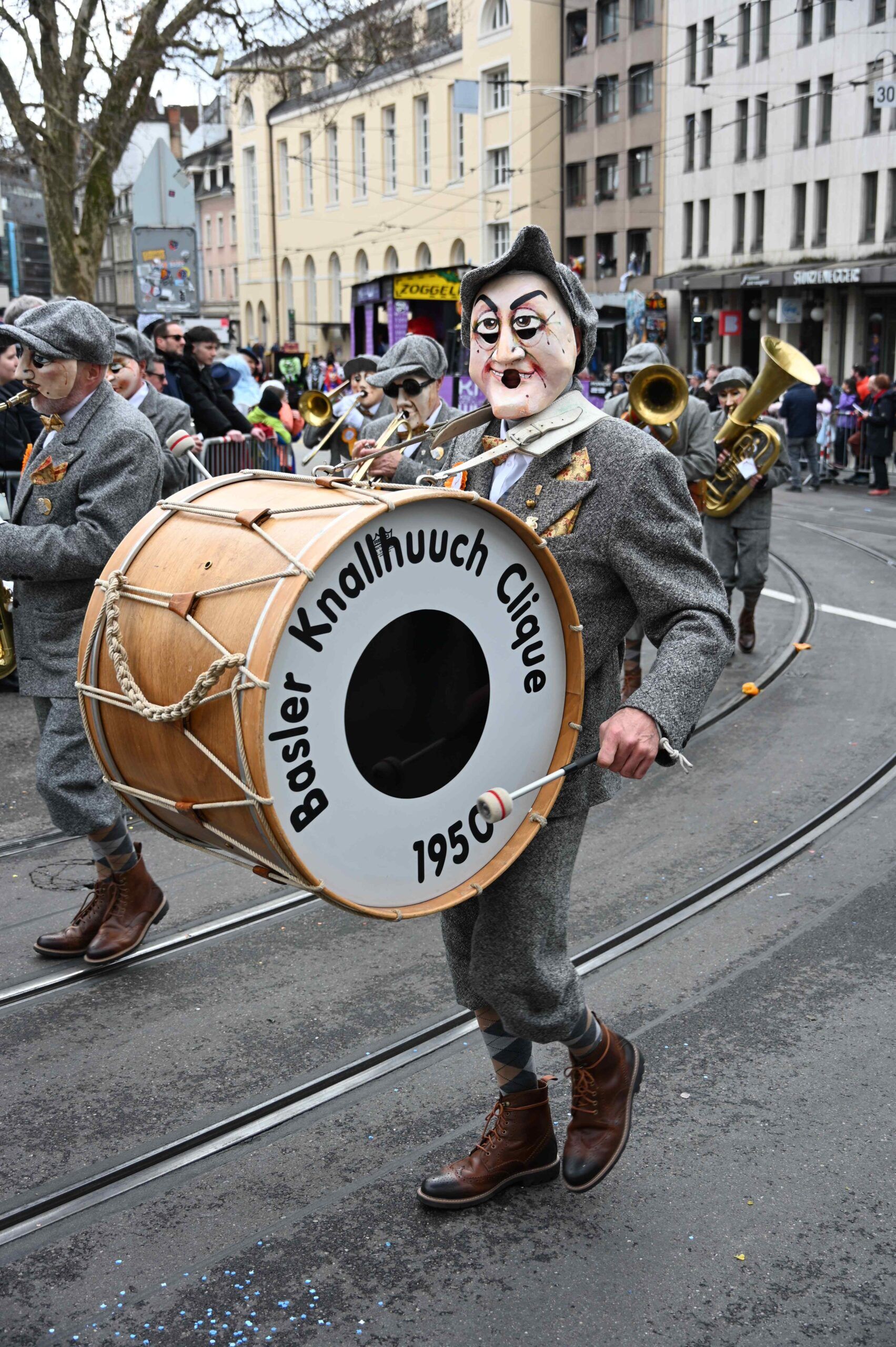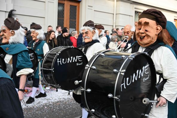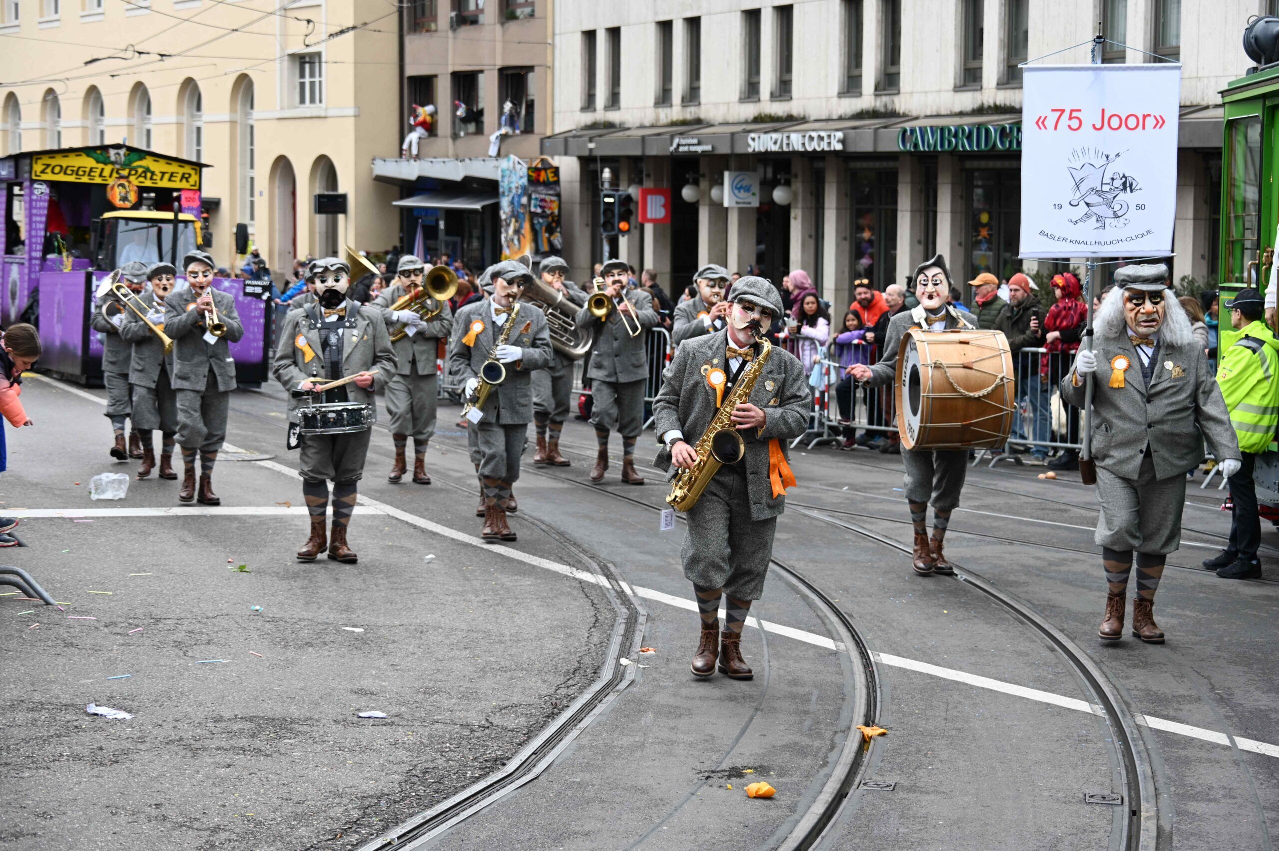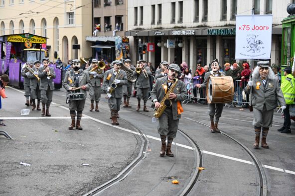 Und dann feiern sich einige Guggen gleich selbst. 75 Joor Melodiebleeser und Guggebleeser ist das Sujet der Basler Knallhuuch-Clique Gründungsjahr 1950. Gratulation zum Dreivierteljahrhundert!
