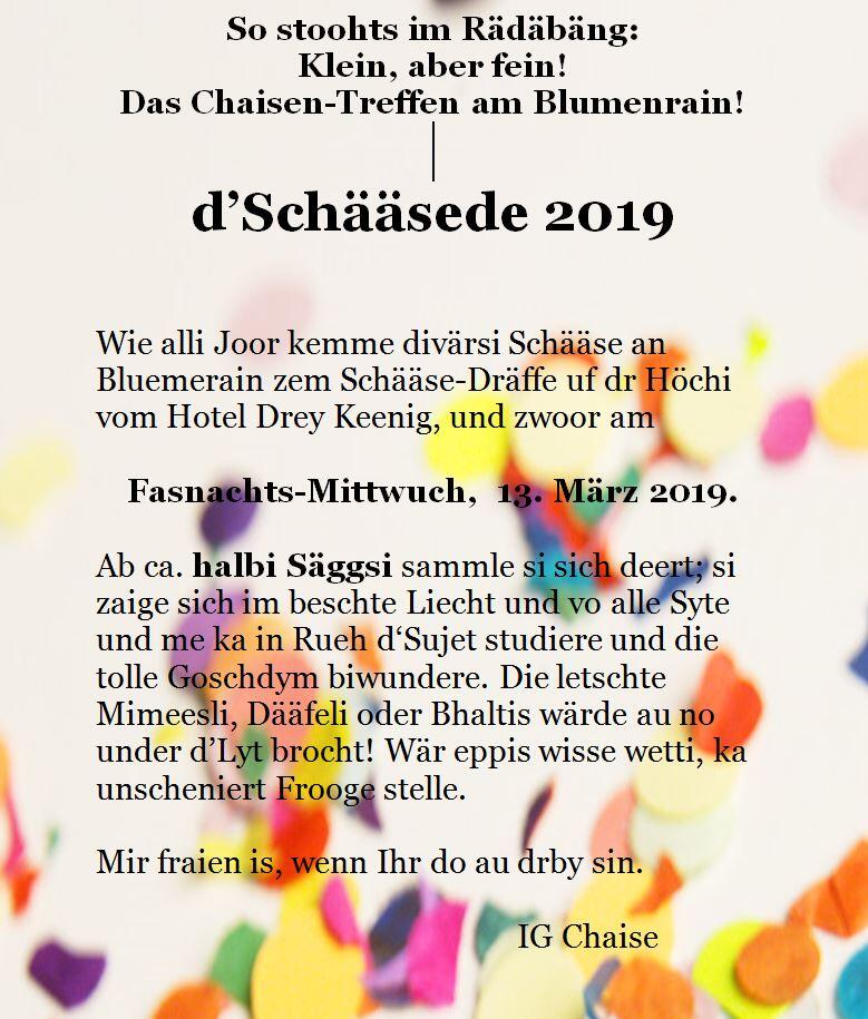 Wie bereits in den vergangenen Jahre präsentieren sich auch an der Fasnacht 2019 verschiedene Chaise (Pferdegespanne) nicht nur auf dem Montags- und Mittwochs-Cortège, sondern sind auch anlässlich der Schääsede beim Hotel drei Waggis  am Blumenrain zu bewundern.