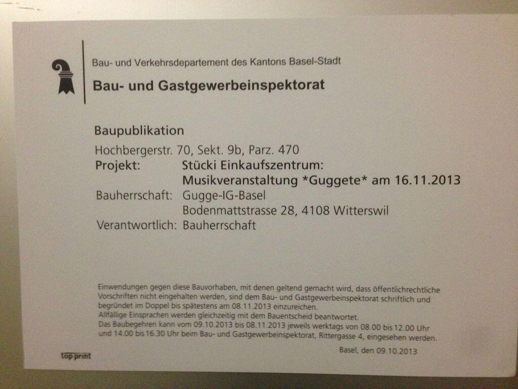 Am Samstag, 16. November 2013 ab 11.00 Uhr findet beim Stücki Shoppingzenter eine «Stücki-Guggete» statt. Organisiert wird der Anlass durch die Gugge IG Basel. Ab 12.00 Uhr spielen im Stundentakt die Baggemugge & Orginal Chnulleri, Stachelbeeri, Glaibasler Schränz Brieder, Grunz Gaischter, Rätsch-Beeri und Märtfraueli. Den Schlusspunkt machen um 18.00 Uhr die Messingkäfer. Neben einem Wettbewerb mit tollen Preisen gibt es zur Unterhaltung noch Kinderschminken und Basteln oder man kann bei einem Würfelspiel sein Glück versuchen. Für das leibliche Wohl ist mit Kaffee und Kuchen gesorgt. An einem Informationsstand können sich Interessierte über die Gugge-IG informiern. Ebenfalls am Stand vertreten sind die LäGGerli-HaGGer, Mohekopf, Schränz-Gritte und Pumperniggel.
