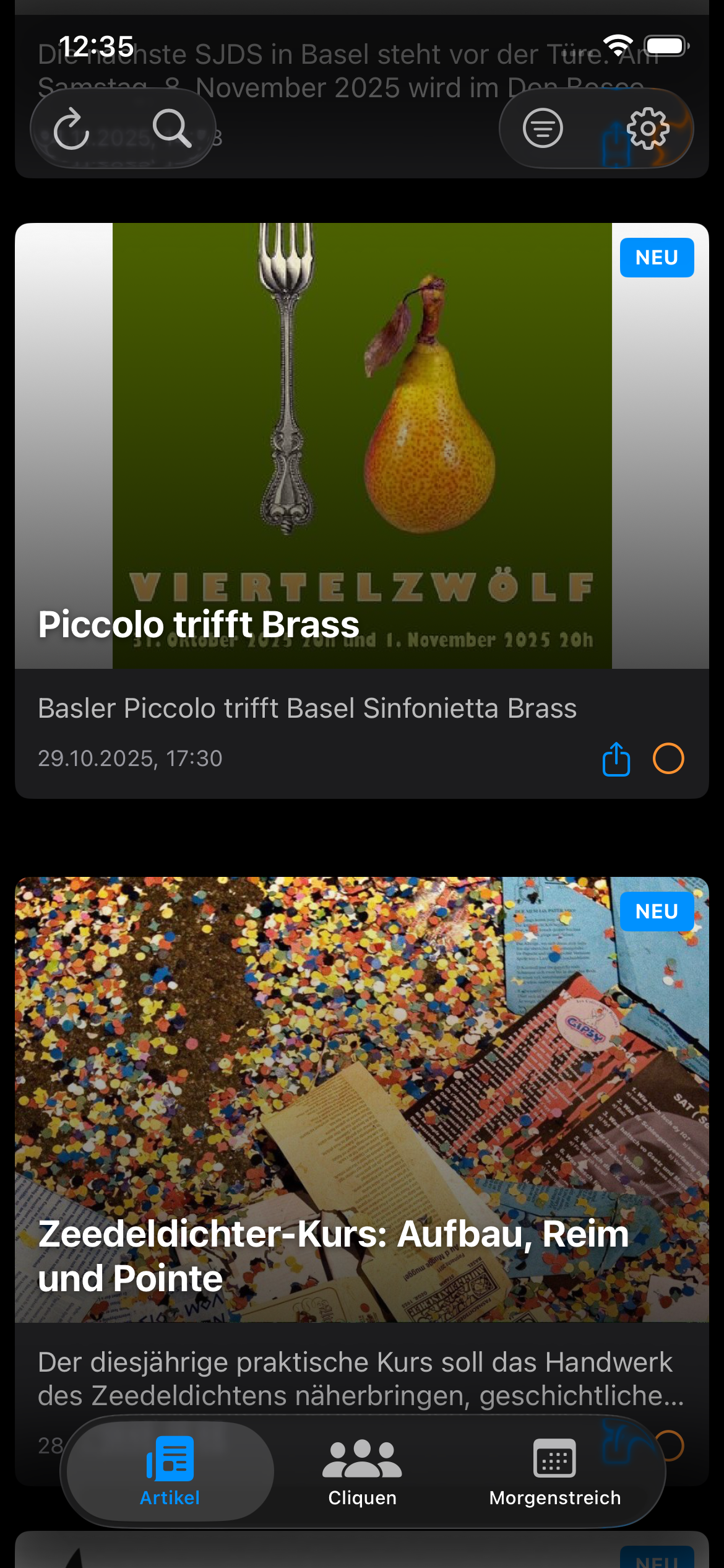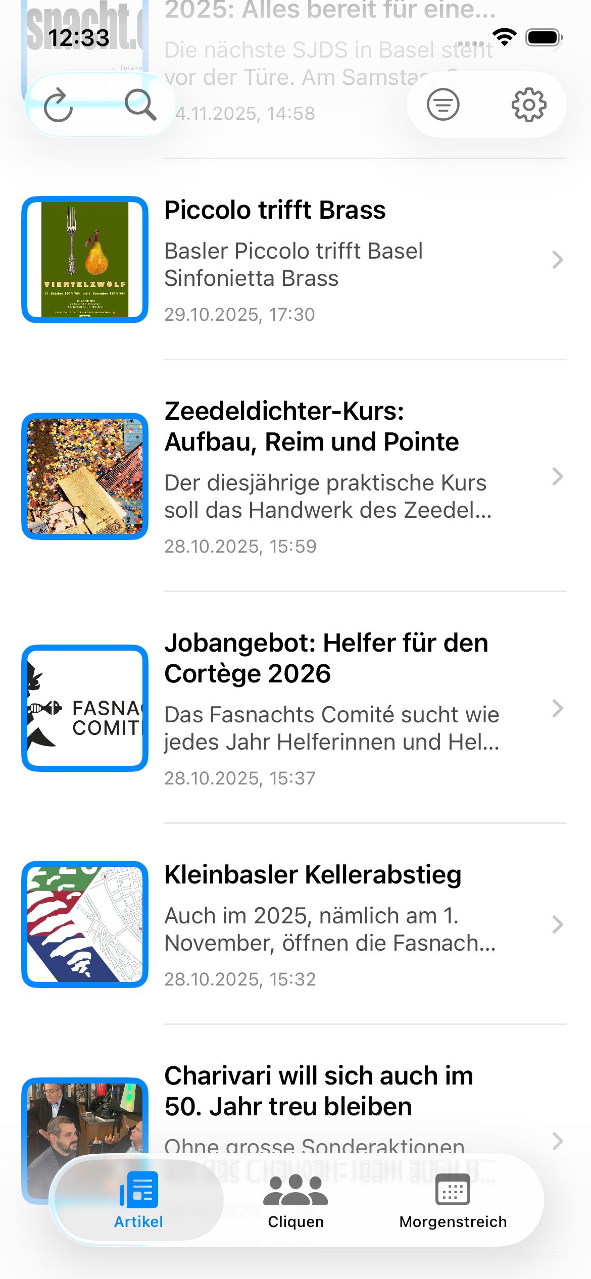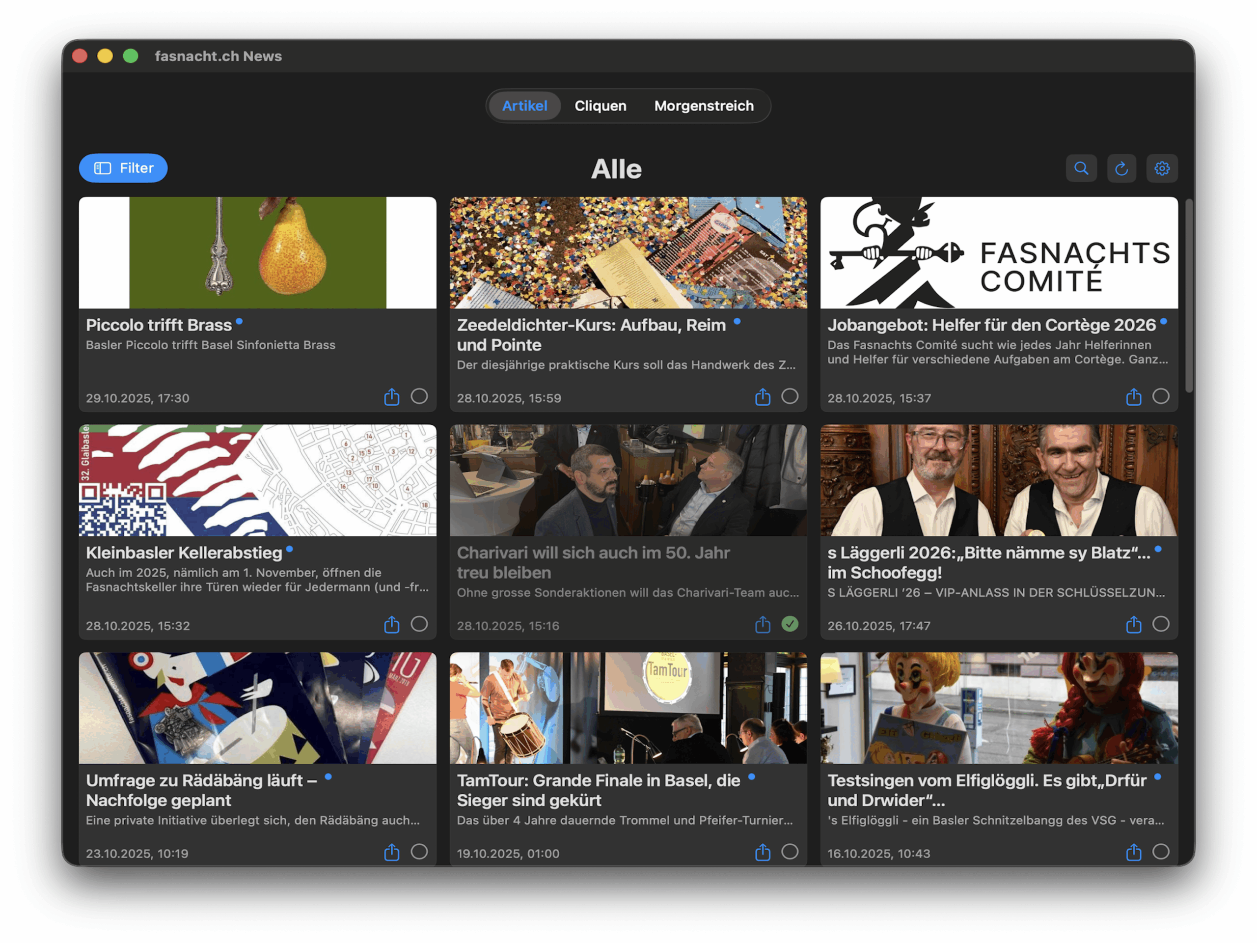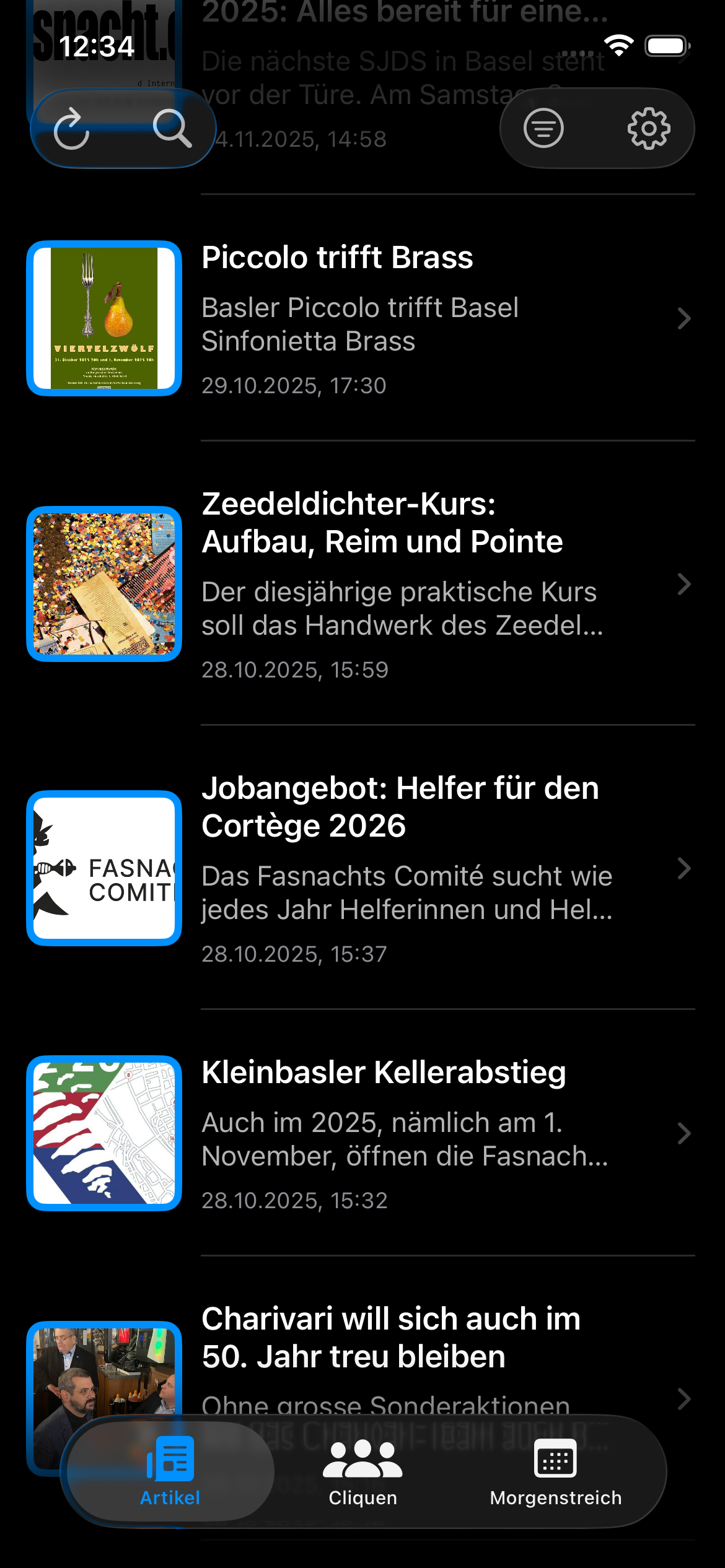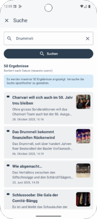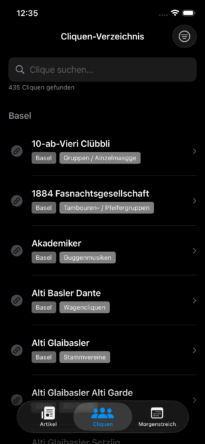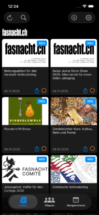 • Neue Tab-Navigation: Der Startbildschirm ist jetzt in drei Bereiche gegliedert – Artikel, Cliquen und Morgenstreich-Termine – für den schnellen Zugriff auf alles Wichtige.