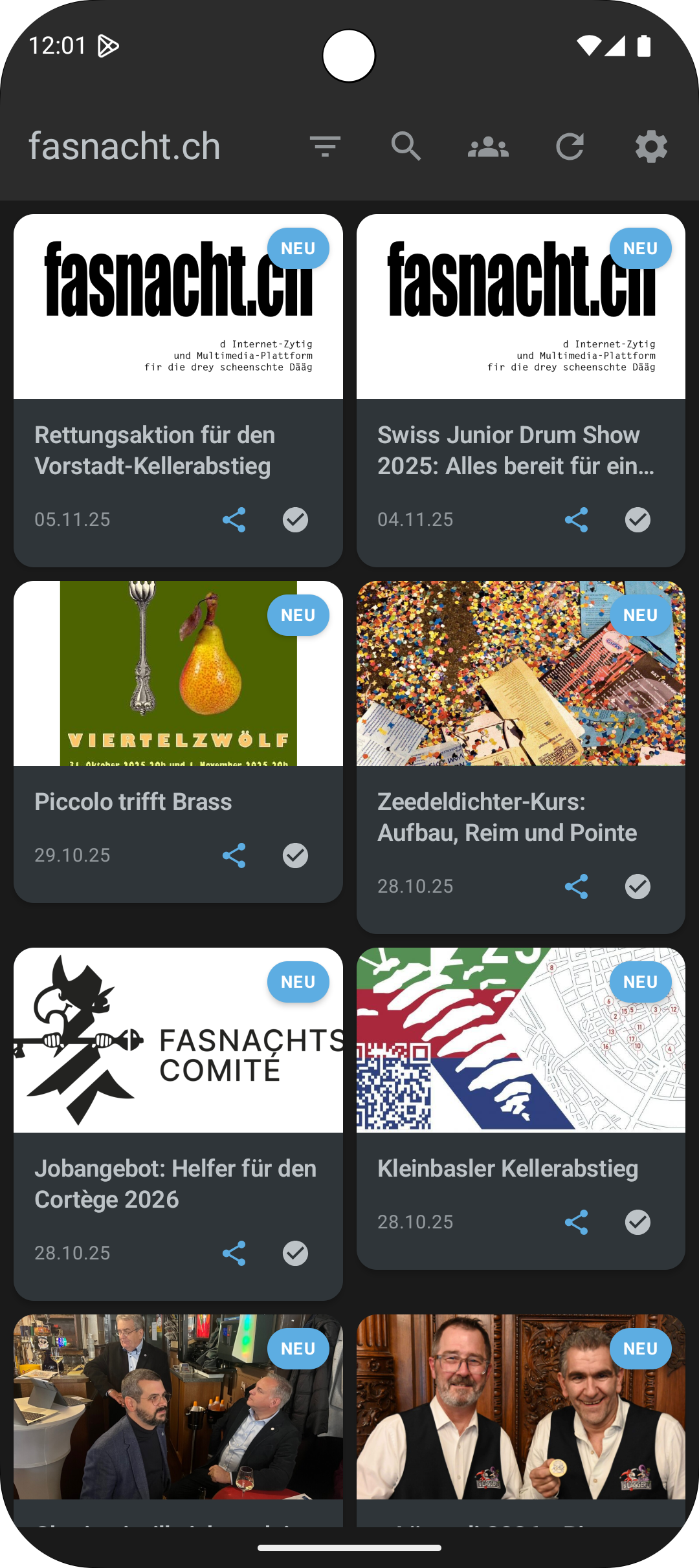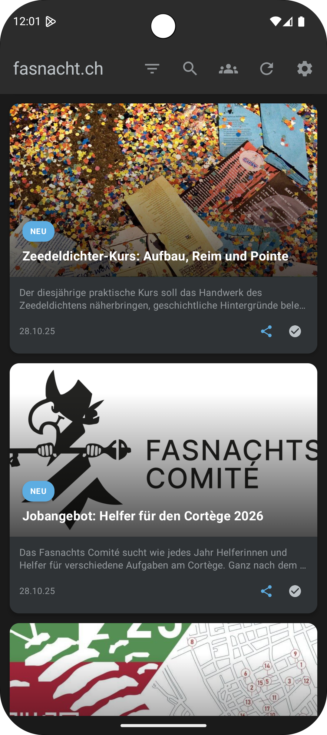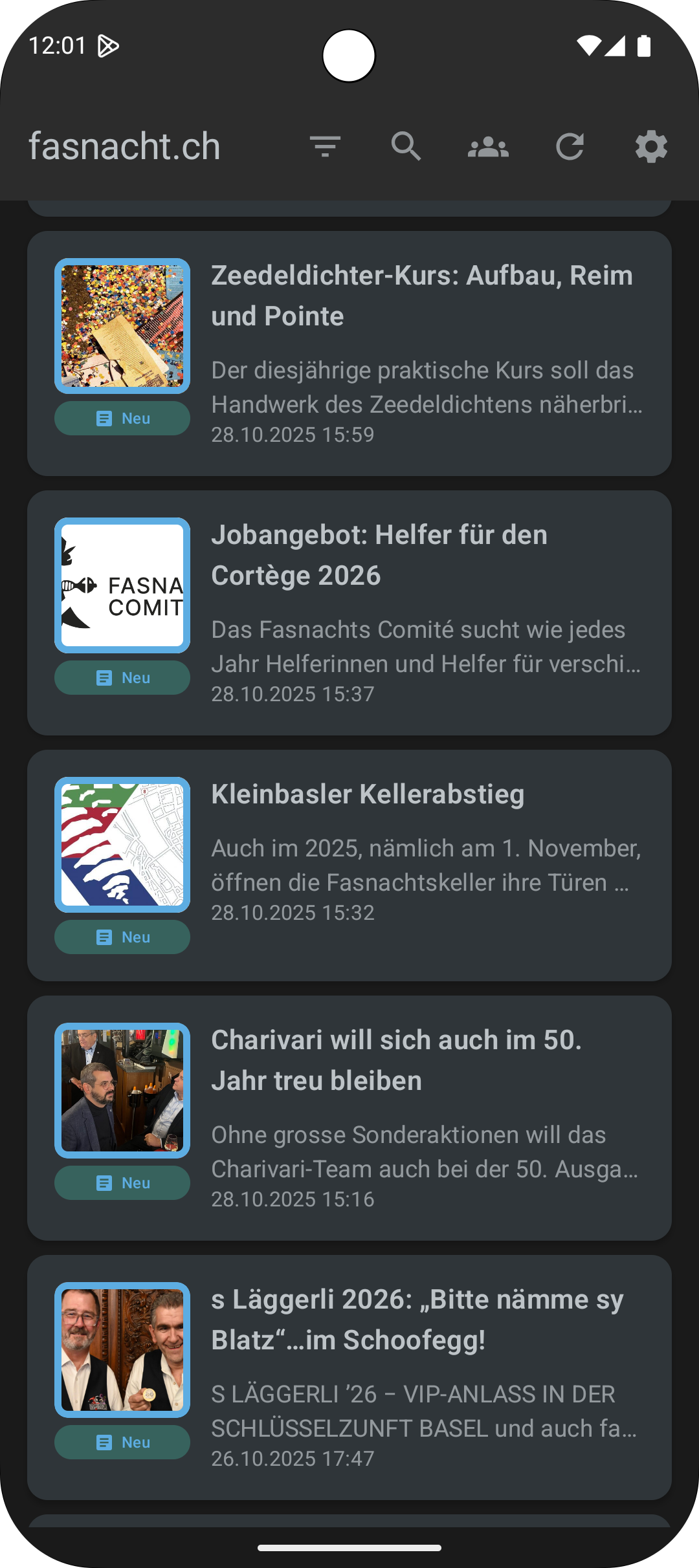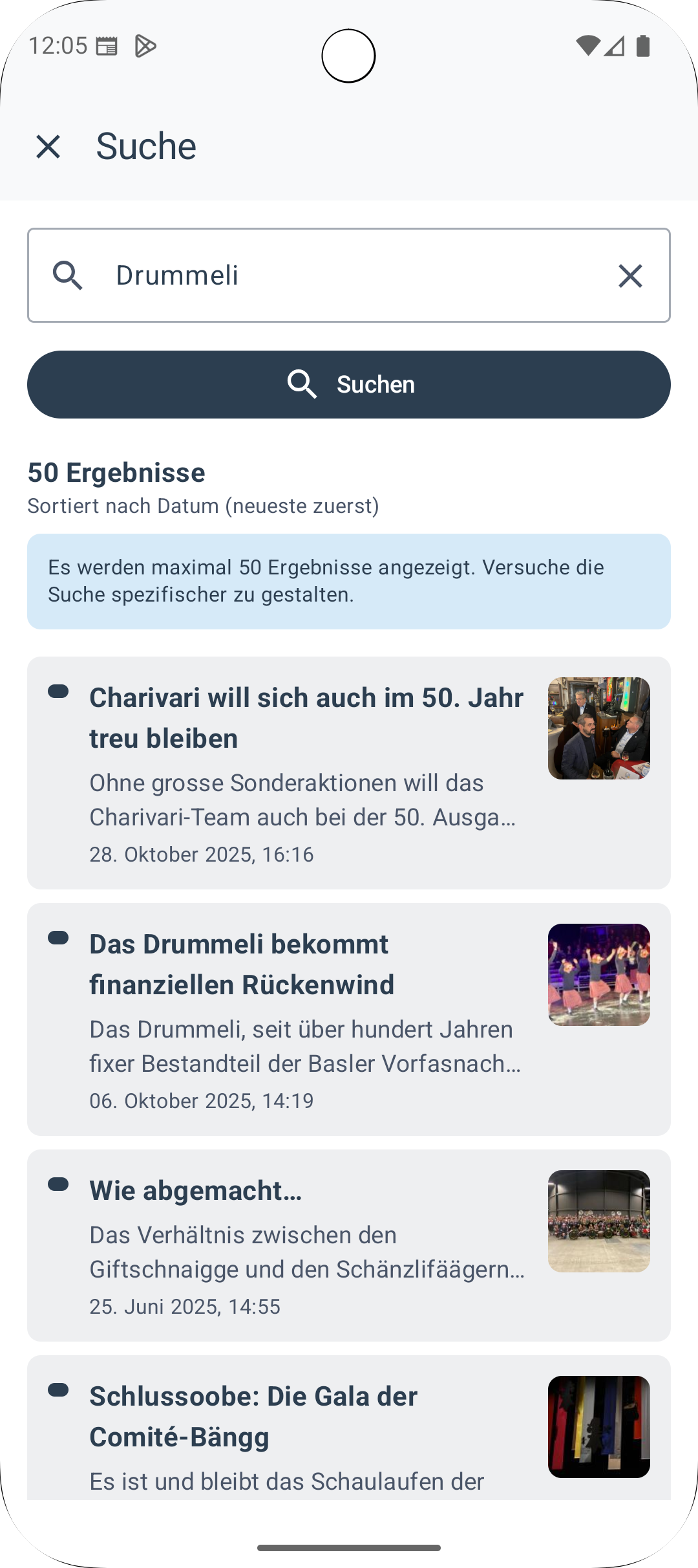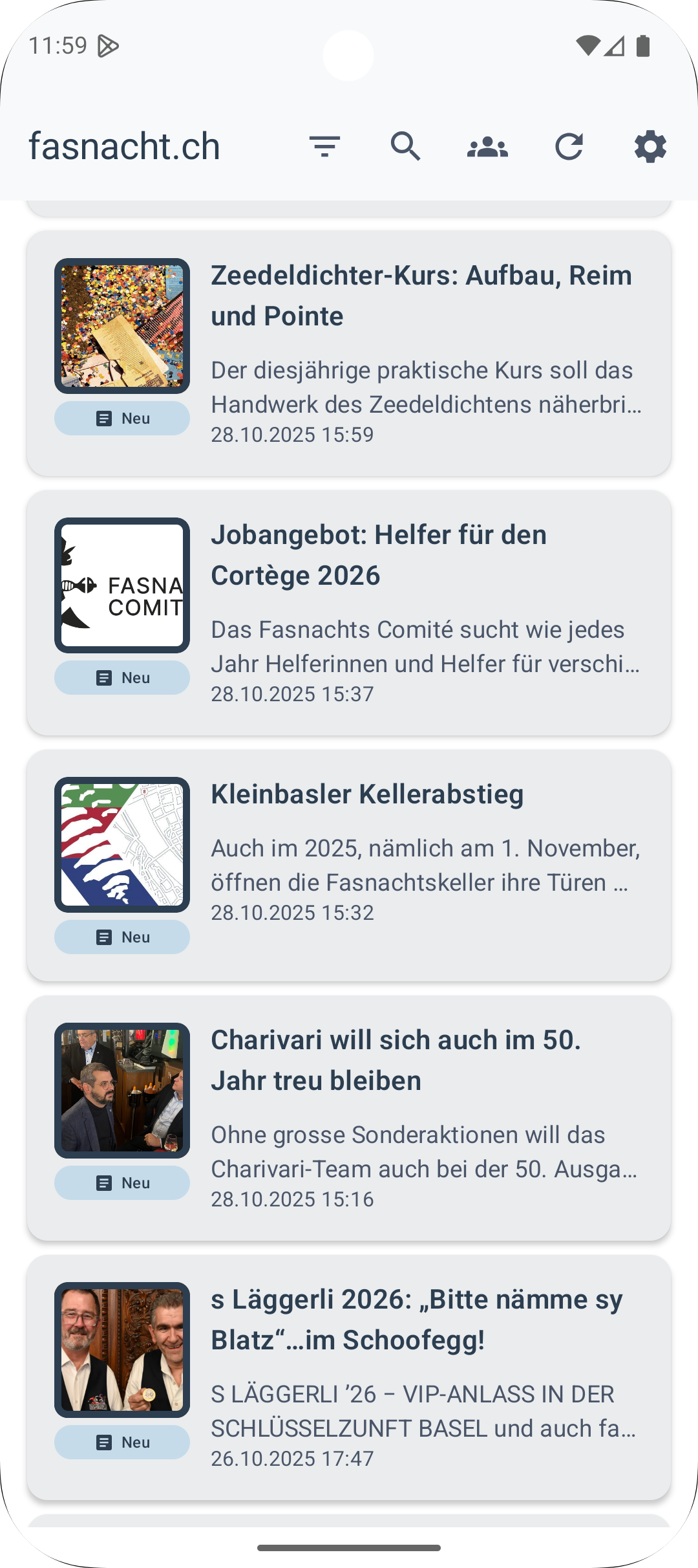 • Neue Tab-Navigation: Der Startbildschirm ist jetzt in drei Bereiche gegliedert – Artikel, Cliquen und Morgenstreich-Termine – für den schnellen Zugriff auf alles Wichtige.