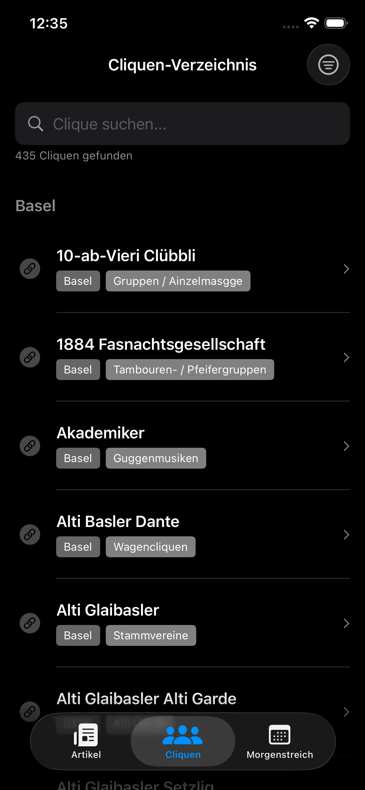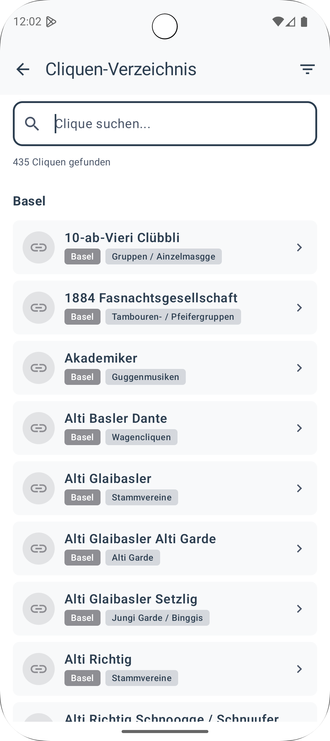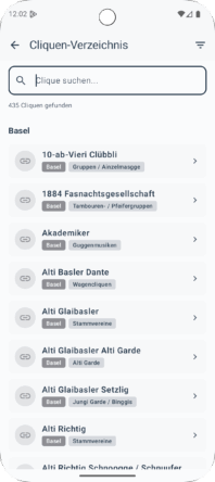 • Vollständiges Cliquen-Verzeichnis: Alle uns bekannten Links zu Webseiten von Basler Fasnachtscliquen sind direkt in der App auffindbar, inklusive Such- und Filterfunktion.