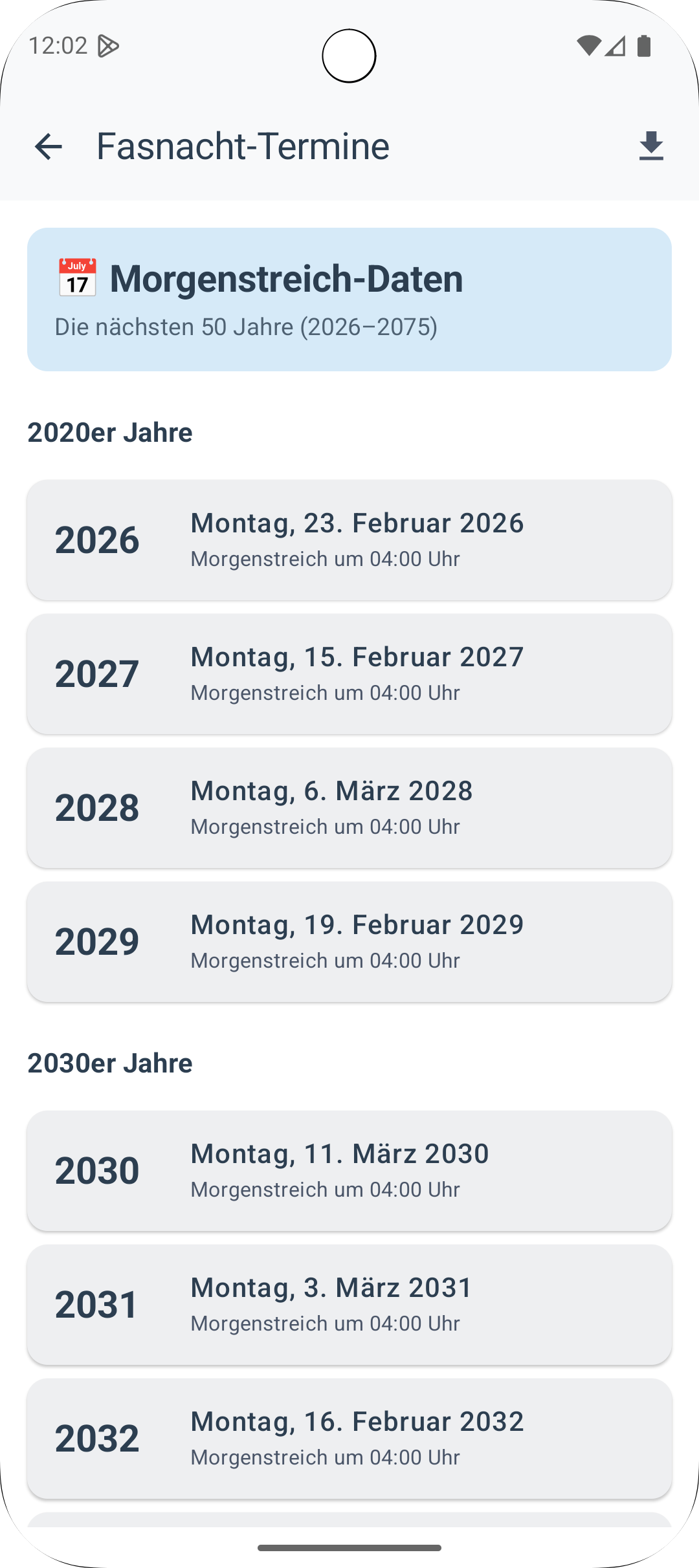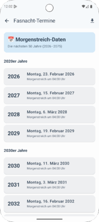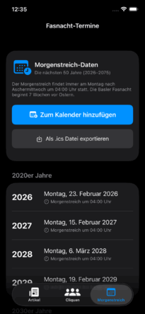 • Langfristige Planung: Die App enthält alle Morgenstreich-Termine bis ins Jahr 2075 und bietet erstmals den Kalender-Export für iOS – so kann man die Fasnachtstermine direkt im eigenen Kalender speichern.