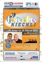 FASNACHTSKIECHLI 2012. Vom 24. Januar bis 18. Februar 2012 im SCALA Basel, Freie Strasse 89. Vorstellungen jeweils Dienstag, Donnerstag, Freitag und Samstag 20 Uhr. Einzige Sonntagsvorstellung am 29. Januar 2012 um 18 Uhr! Eintrittspreise: 52 Franken, für AHV/IV, Studenten, Schüler und Gruppen ab 10 Personen 47 Franken. Vorverkauf: Bider & Tanner, Aeschenvorstadt 2, 4010 Basel, Telefon 061 206 99 96, Online www.biderundtanner.ch, sowie an allen Ticket-Vorverkaufsstellen. Die Abendkasse ist an den Spieltagen (siehe unter Spieldaten www.fasnachtskiechli.ch) eine Stunde vor Vorstellungsbeginn geöffnet.