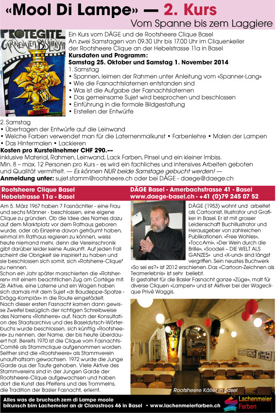 Unter dem Titel «Mool Di Lampe – Vom Spanne bis zem Laggiere» bieten der bekannte Laternenmaler, Cartoonist und Buchautor DÄGE und die Rootsheere Clique an zwei Samstagen einen Kurs an.