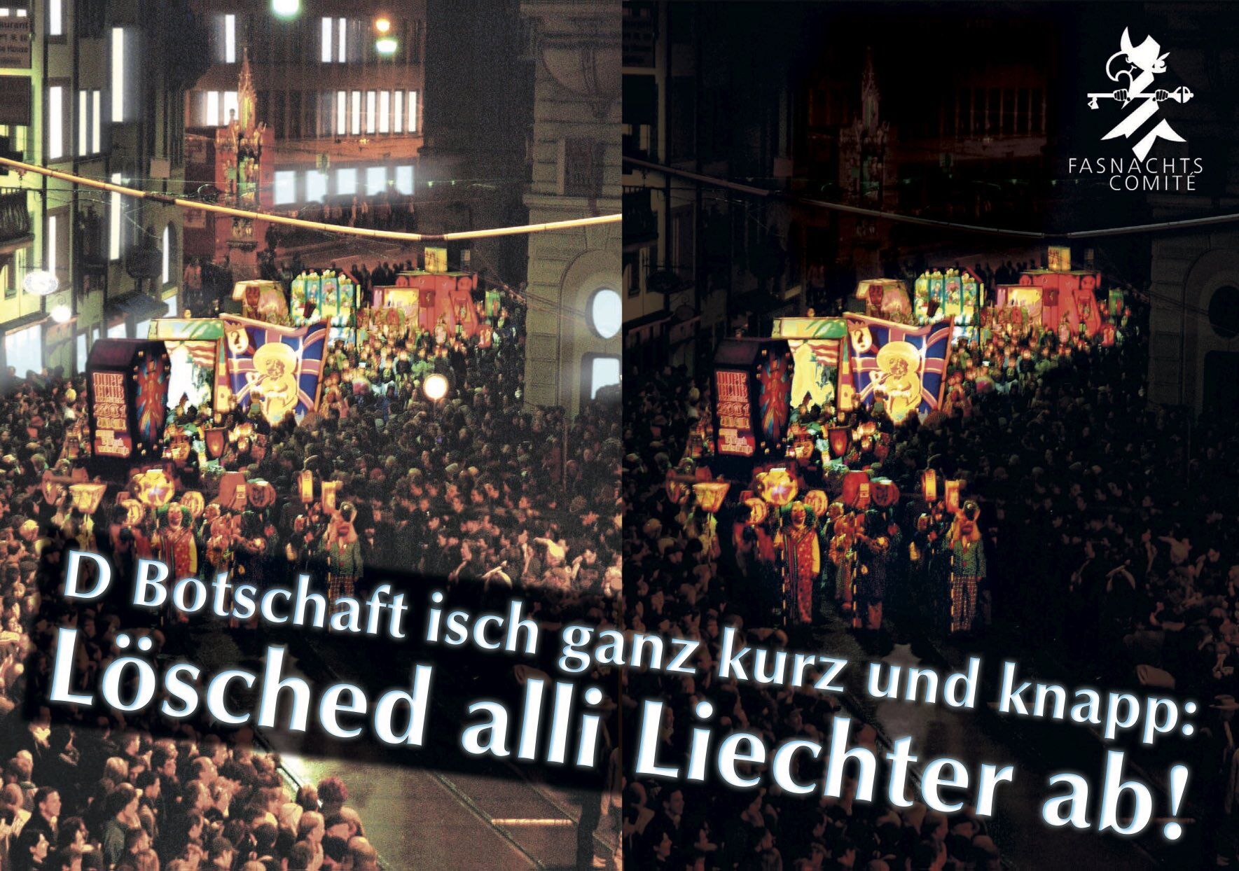 Auch im 2020 wird das Comité Anstrengungen unternehmen, damit die Verdunklung am Fasnachts-Montag um 4 Uhr eingehalten wird. Die Bemühungen in den letzten Jahren zeigten Wirkung – es gibt aber noch Luft nach oben. Das Fasnachts-Comité weist darauf hin, dass beleuchtete Schaufenster und Reklamen nicht nur die fasnächtliche Stimmung stören, sondern auch eine Übertretung darstellen, die gebüsst werden kann.