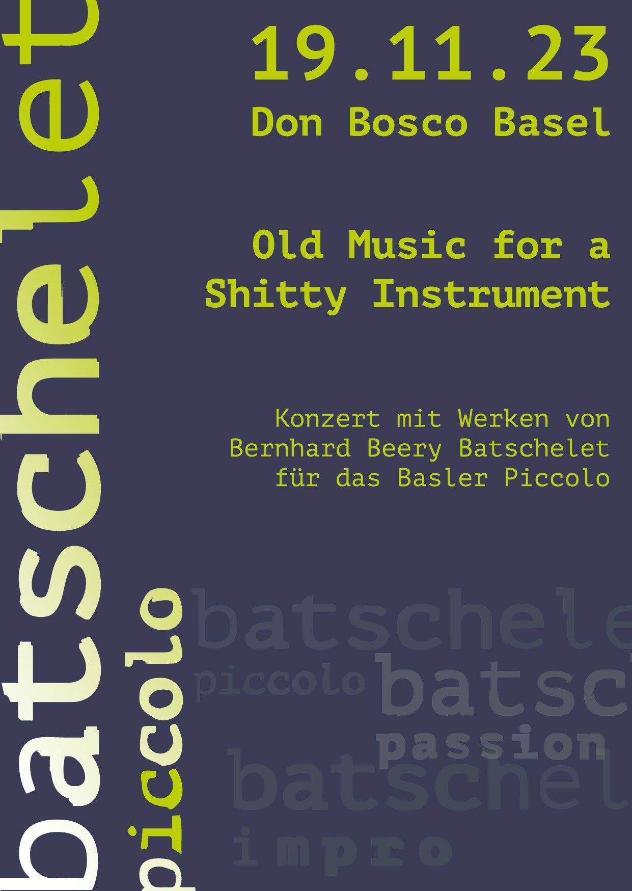Dieser vielleicht etwas gewöhnungsbedürfte Titel entspricht einem Zitat des viel zu früh verstorbenen Komponisten Bernhard Beery Batschelet. Ihm zu Ehren werden seine Werke für das Basler Piccolo am 19. November 2023 vom Basler Piccoloensemble (bekannt vom Ufftaggt) und Ivan Kym in der Don Bosco Kirche aufgeführt. Gastmusiker sind Sylwia Zytynska, Perkussionistin, Peter-Lukas Graf und Felix Renggli, Flötisten, Gamelan Ensemble